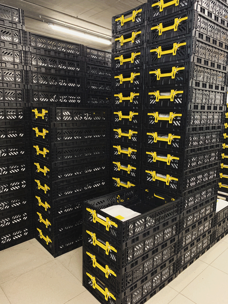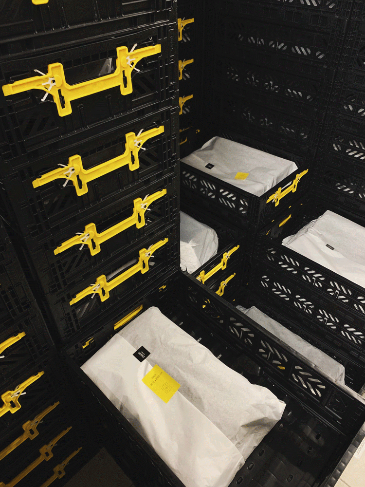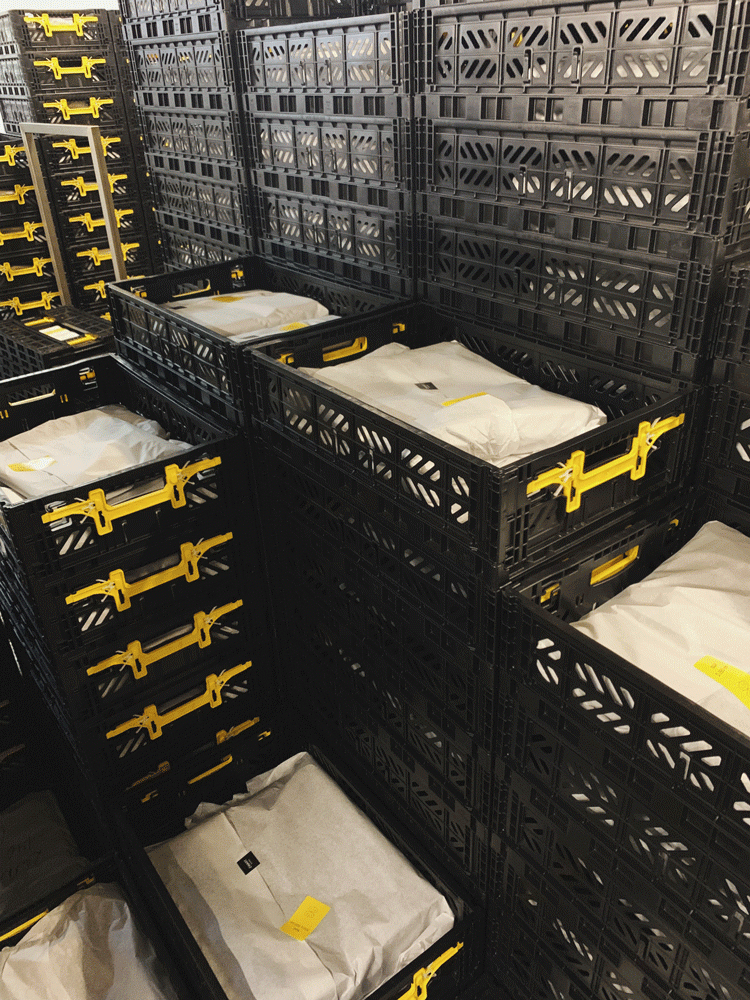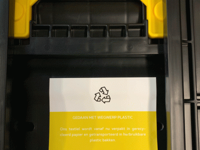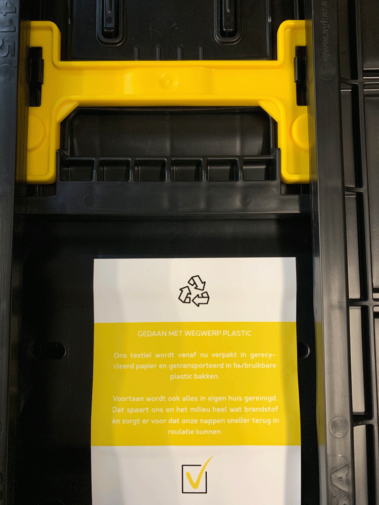 De plastic zakken waarin alle textiel vroeger bij de klant werd geleverd hebben we vervangen door herbruikbare bakken. Het linnen wordt beschermd tegen stof met FSC goedgekeurd, gerecycleerd papier.